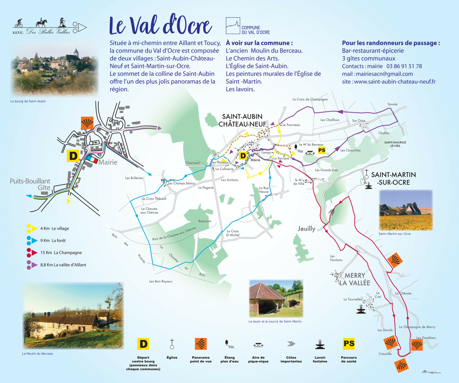 La commune du Val d’Ocre est sillonnée de nombreux chemins ruraux permettant de découvrir le paysage vallonné qui l’entoure. Le village de Saint-Aubin, perché sur sa colline, offre un des plus jolis panoramas de la région. Les « chemins creux » permettent de randonner à l’abri du soleil estival. Une carte d’ensemble présente une sélection de 4 chemins balisés avec 4 couleurs différentes : |